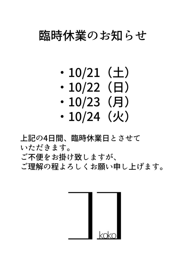 ◻︎臨時休業のお知らせ◻︎ ・10/21(土) ・10/22(日) ・10/23(月) ・10/24(火) 上記の四日間を臨時休業日とさせていただきます。 ご不便をお掛け致しますが、ご理解の程 […]